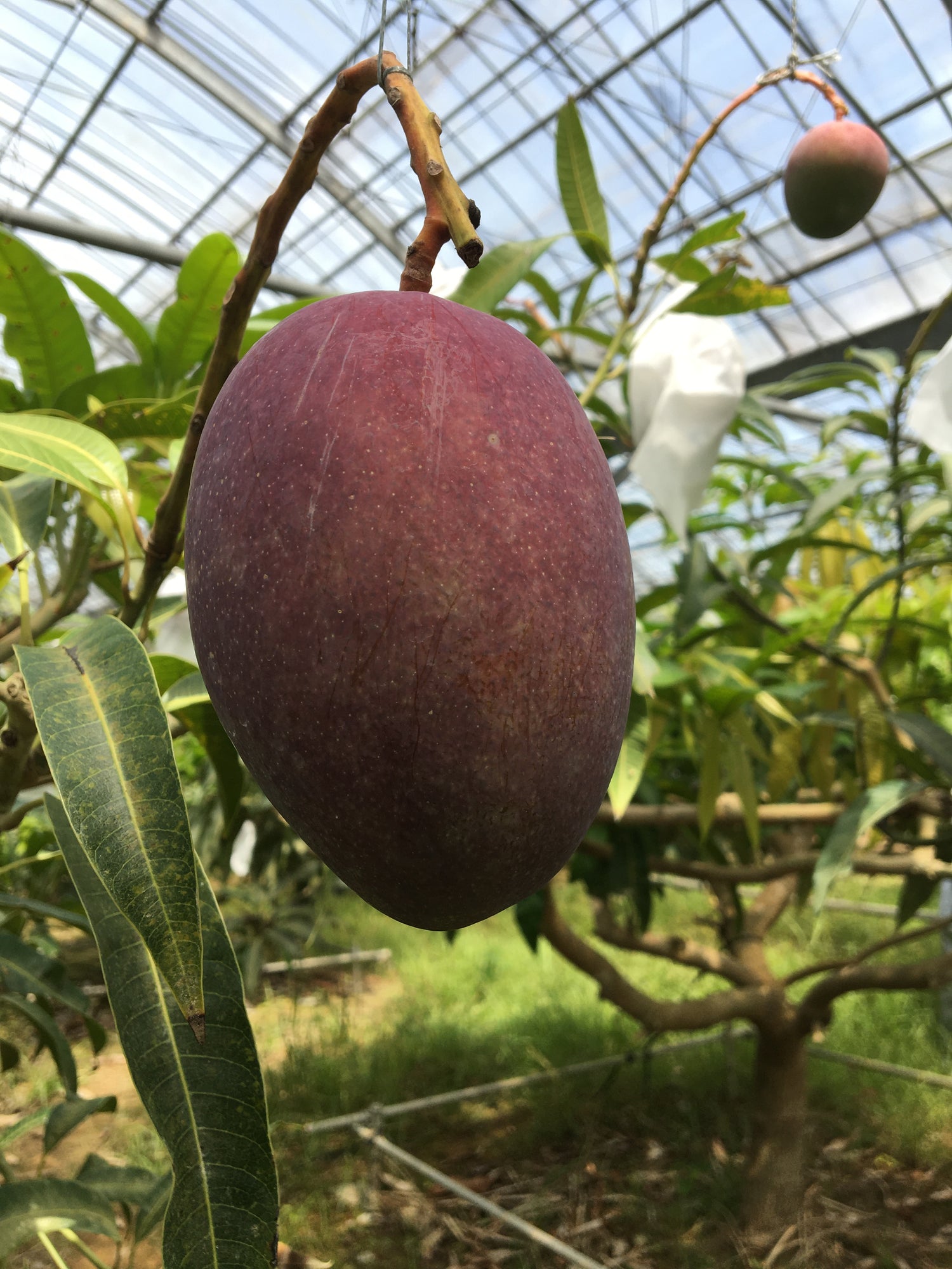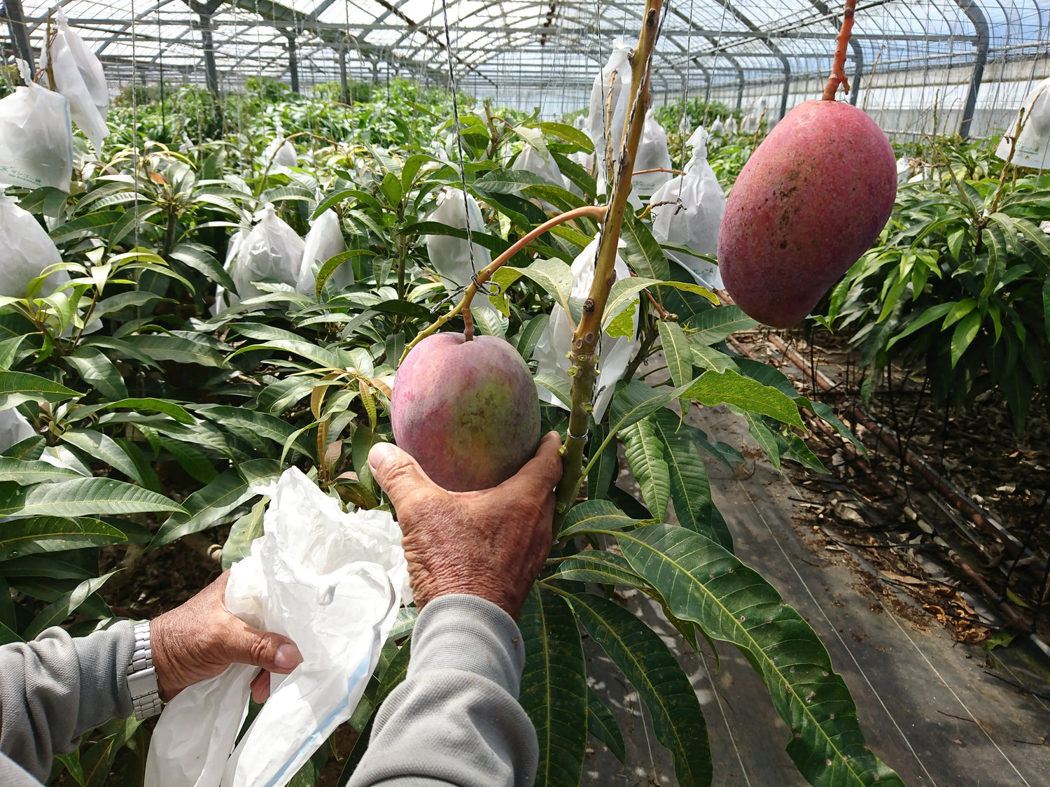 在沖繩鐵板燒一般的炎天下,芒果悄悄地先變暗紫,再變橙紅。總唔能夠塗防曬掛,唯有以物理方式保護: 套上附有鐵線的紙袋,固定在果枝上,既可防曬傷,又防止一個唔小心高空墜落。