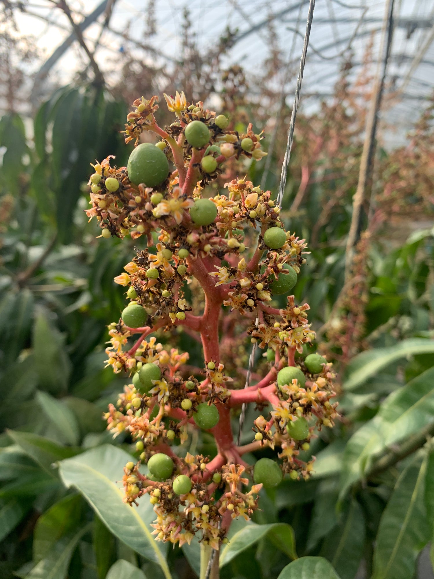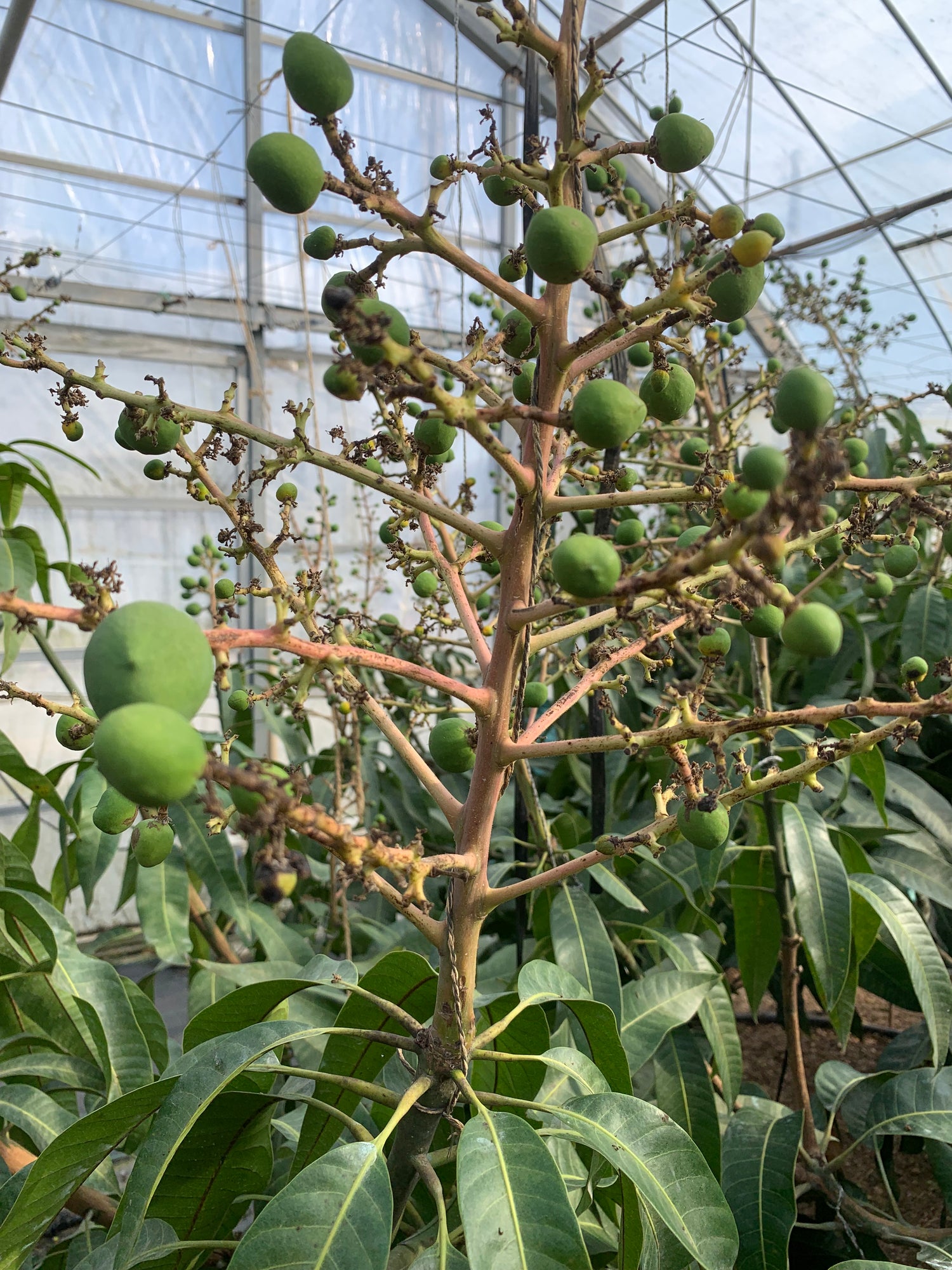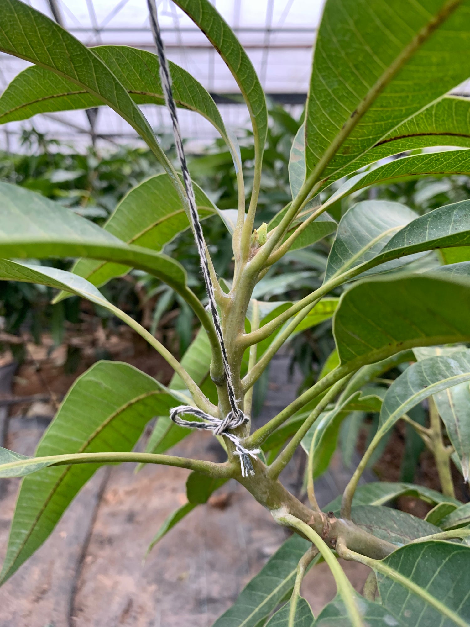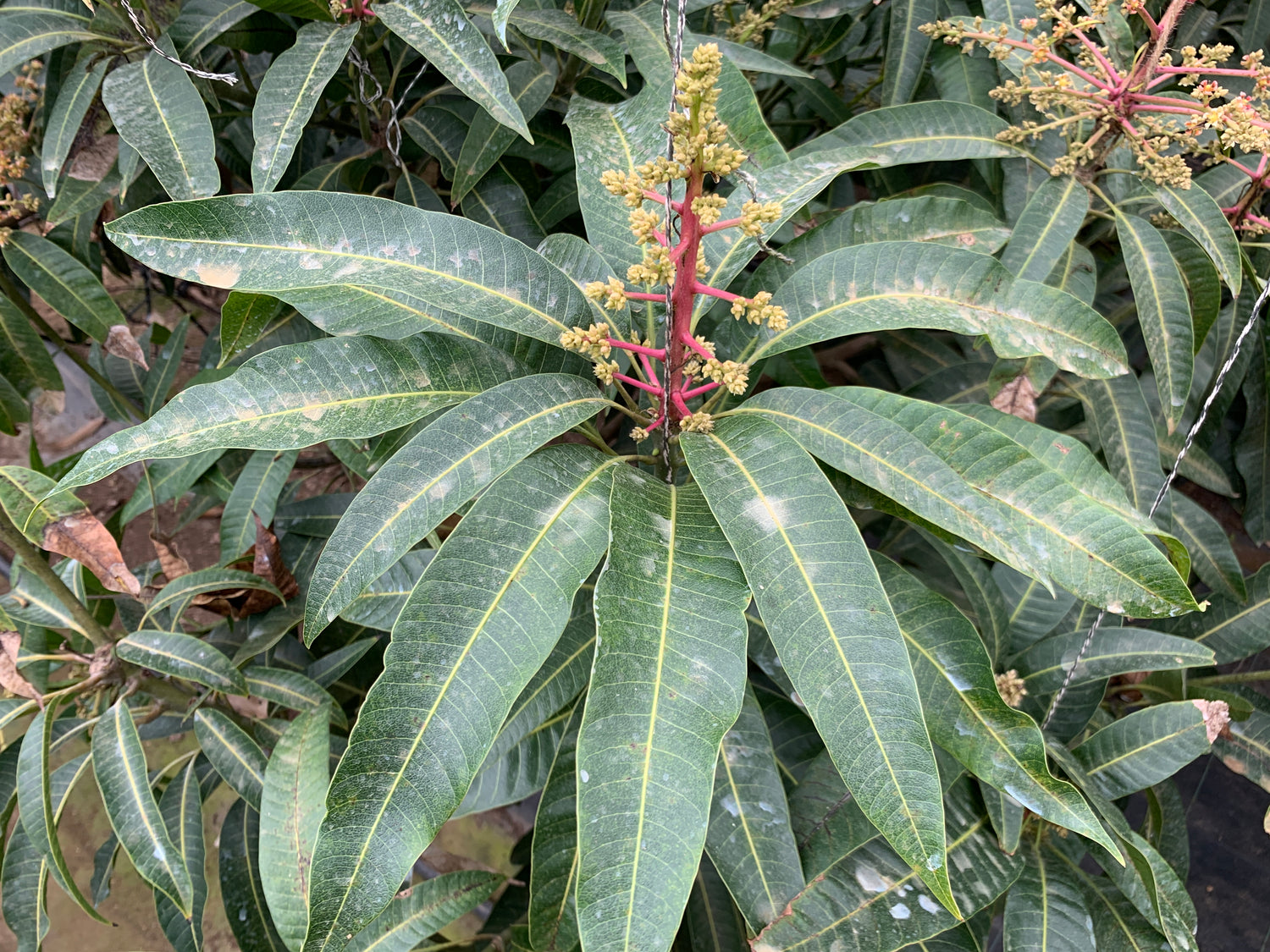 最最最重要的一步,不是打理花果,是樹。果樹的修枝管理妥當,果樹枝樹葉能平均得到陽光及養分,才能好好開花結果,第一年,不敢大幅修剪,結果枝葉過多,種植過程中多次被葉尖毀容。「誘引」果樹的主枝往地面,限制芒果樹整體的高度。